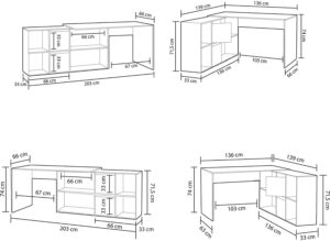 - DIMENSIONS EN CM – Bureau d’angle: Longueur: 136 Largeur: 139 Hauteur: 74 – Bureau linéaire: 203x66h74
