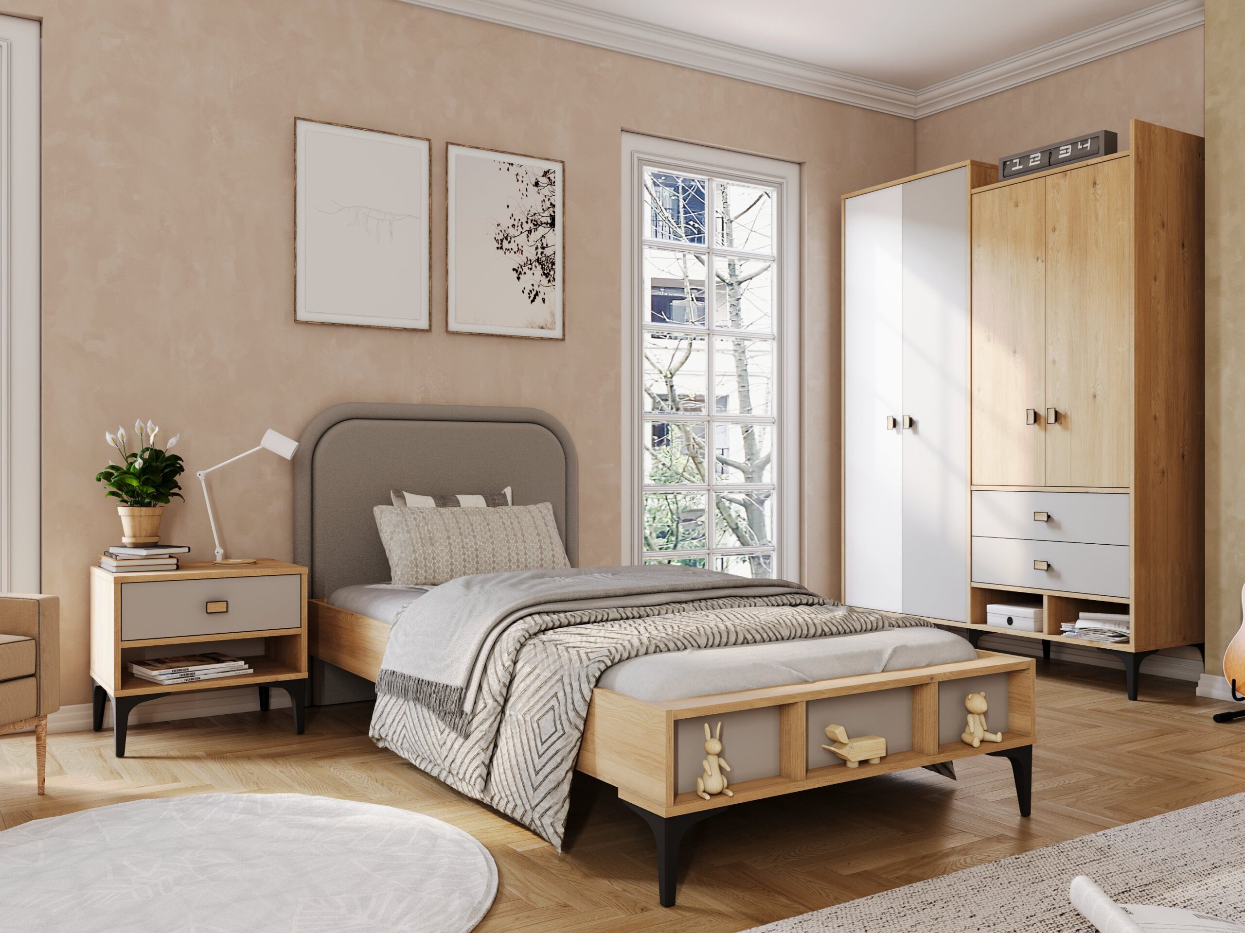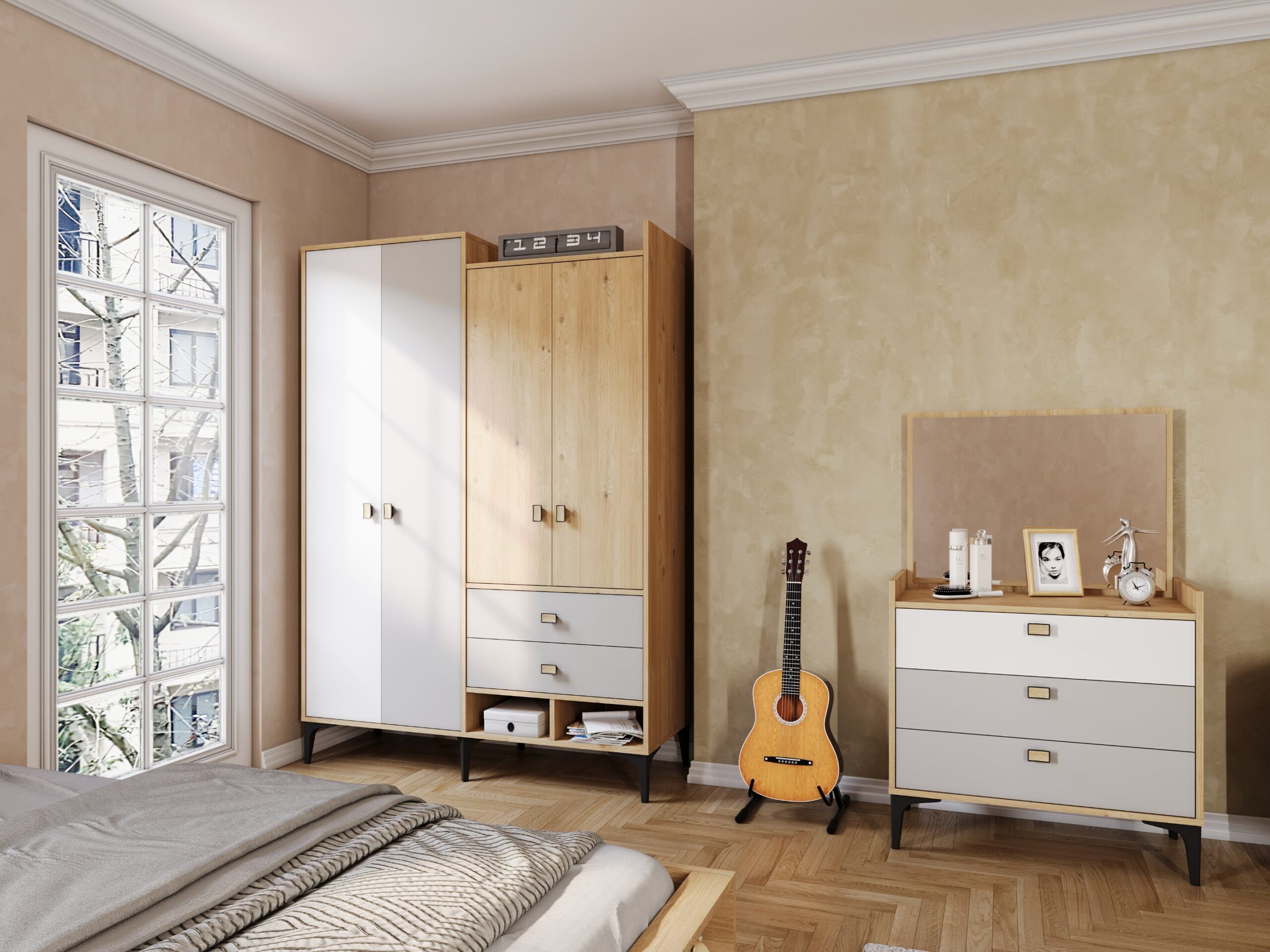 L’Armoire Bella GRIS est la solution de rangement la plus complète de la collection. Avec ses 4 portes et ses multiples compartiments, elle offre une organisation optimale tout en devenant une pièce maîtresse de la chambre grâce à son architecture moderne et ses jeux de couleurs subtils.
