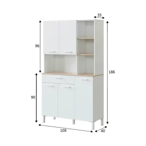 Armoire auxiliaire haute, composée de 5 portes, 1 tiroir, une étagère intégrée à 2 étagères et un trou pour mettre votre micro – ondes. Fabriqué en mélaminé de haute qualité en artik blanc avec l’étagère en chêne canadien et les pieds en aluminium peints en blanc. Oubliez les problèmes de rangement dans votre cuisine. Ce meuble d’appoint haut est le complément parfait pour accompagner le mobilier de votre cuisine et simplifiez-vous la vie. Dimensions : 186 x 108 x 40 cm. Coloris : blanc artic / chêne canadien. Poids : 64.00 KG. Produit de fabrication Espagnol certifié PEFC.