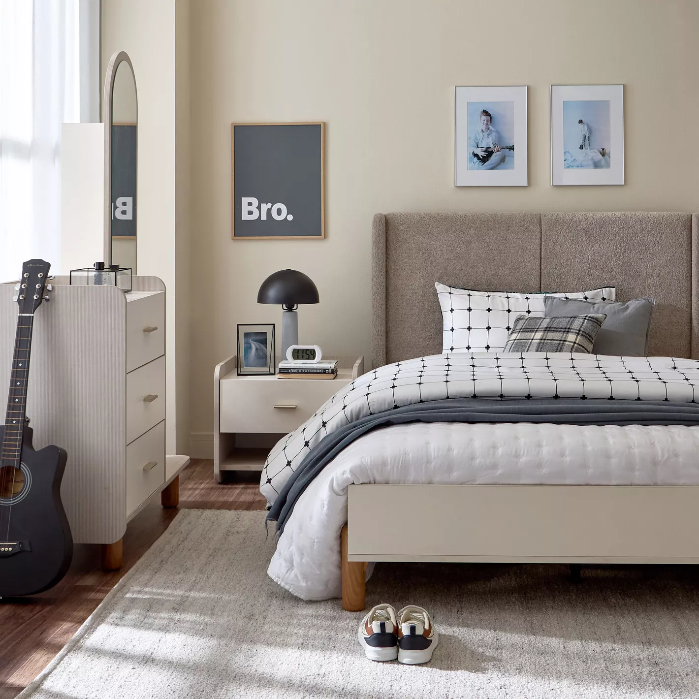 Cadre Texturé : Le miroir est encadré par le même matériau texturé bois clair que les côtés de la commode, assurant une cohérence parfaite.